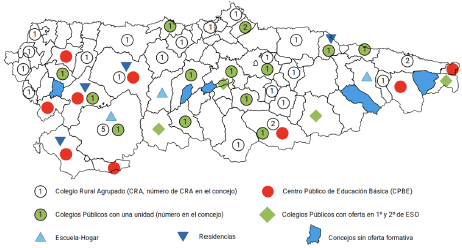 Así pues, al contextualizar esta investigación en Asturias (España), las escuelas rurales se clasifican en Colegios Rurales Agrupados (CRA), que acogen alumnado de Educación Infantil (EI) (3-6 años) y Educación Primaria (EP) (6-12 años) en aulas multigrado procedentes de pueblos cercanos de menos de 2000 habitantes; Centros Públicos de Educación Básica (CPEB), que recogen alumnos de Educación Básica Obligatoria (EBO) (6-12 años) y Educación Secundaria Obligatoria (ESO) (12-15 años); Colegios Públicos "unitarios", que poseen un aula multinivel integrando EI y EP; y Escuelas Hogar/Residencias. Todos ellos están fuera del ámbito de las principales localidades de los concejos, salvo en el caso de los CPEB, como se presenta en la figura 1.