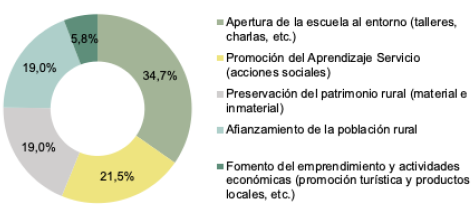 En la figura 3, se observa que, mayoritariamente, el 34,7 % de los proyectos en los que participan las escuelas rurales asturianas buscan su apertura al territorio para propiciar el enriquecimiento mutuo, ofertando a la población talleres, ciclos de conferencias y/o cursos. El 21,5 % promueve el aprendizaje servicio al implicar a las escuelas en acciones sociales (acompañamiento a mayores, limpieza del medio natural, etc.). Un 19,0 % busca preservar el patrimonio rural material e inmaterial conservando los hórreos, paneras y cabazos (construcciones agrarias típicas asturianas) y manteniendo viva la memoria de canciones y folklore popular.
