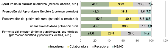 Mayoritariamente, los directores subrayan el papel de la escuela como impulsora y colaboradora en los proyectos en los que participa. La escuela constituye un foco de dinamización cultural del entorno, lo que se plasma a través de los proyectos formativos que lidera, los cuales enfatizan su apertura al territorio, al impulsar acciones sociales, y contribuyen a la preservación del patrimonio. Además, de forma indirecta se favorece el afianzamiento de la población rural, pues su existencia garantiza la presencia de familias en los pueblos (Lethonen, 2021). Lógicamente, las escuelas no tienen como finalidad la promoción turística del entorno ni el emprendimiento, pero su colaboración con entidades locales puede ayudar a reactivar la vida de los pueblos, algo que genera empleo y riqueza.