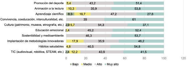 La mayoría afirma impulsar o participar en proyectos donde se prioriza una gran variedad de temáticas, como se presenta en la tabla 2, algunas asociadas a los Objetivos de Desarrollo Sostenible (ODS) como el cuidado del medioambiente, los hábitos saludables, el deporte, la convivencia, la coeducación y la interculturalidad. Otros poseen un componente cultural, revalorizando el territorio. También existen proyectos estrictamente pedagógicos, relacionados con estrategias metodológicas que inciden en la formación de los escolares en materias del currículum, valores, etc.
