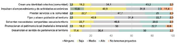 Como se presenta en la figura 9, el 86,4 % de las escuelas aseveran que impulsan proyectos que favorecen el sentido de pertenencia al territorio. El 77,3 % indica que sus propuestas contribuyen en gran medida a crear una identidad colectiva. Otro 75,0 % afirma promover iniciativas que ayudan a solventar las necesidades compartidas por la escuela y el territorio. Un 72,7 % señala que sus proyectos ofrecen servicios a la comunidad local. Otro 72,7 % apunta que promocionan el patrimonio local (material e inmaterial). El 54,5 % de las escuelas impulsan iniciativas que permiten fijar y atraer población al territorio. Por último, un 34,1 % señala que sus propuestas promueven el emprendimiento y la actividad económica local.