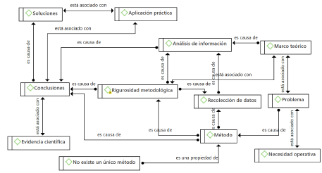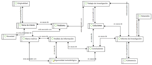 Se identifica como punto de partida la necesidad de abordar un tema de interés, para el campo del conocimiento, que se caracterice por ser novedoso y original, el cual lleva al planteamiento de un problema que se asocia con la elección de un método riguroso y es causa de la identificación de un marco teórico. Con base en el método (código fusionado con rigurosidad metodológica), se realiza el proceso de análisis de información, el cual lleva a la determinación de conclusiones y a la generación del informe de investigación que, a su vez, es causa de la identificación de soluciones y tiene como propiedades la coherencia y la extensión mínima adecuada.