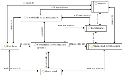 Se identifica que el 75 % de los participantes consideran que la consultoría no es investigación aplicada, relación de contradicción identificada en la red, la cual consta de siete códigos. Entre lo relacionado, la principal diferencia entre las dos posturas se da en que no se considera la consultoría como investigación aplicada principalmente por el método; por la rigurosidad metodológica, identificada en el proceso de investigación; además, por la necesidad de la construcción de un marco teórico que se asocia con el problema, el método y desemboca en las conclusiones. De la consultoría se reconoce que parte de un problema y de la existencia de un método que lleva a un proceso de generación de conclusiones, sin embargo, ninguno de los participantes relacionó la consultoría con la creación de un marco teórico.