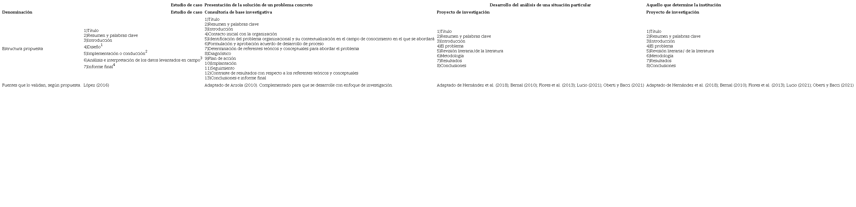 En cuanto a la estructura, sin importar el tipo de trabajo de investigación que se seleccione (estudio de caso, presentación de la solución de un problema concreto, desarrollo del análisis de una situación particular y aquello que determine la institución), debe abordar unos parámetros mínimos que lleven a la validación del conocimiento existente o a la generación de nuevo conocimiento.