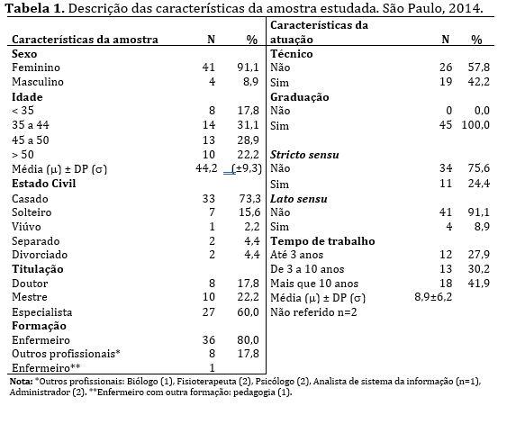 Os 45 docentes tinham em média 44,2 anos (±9,3) e eram na maioria mulheres (91,1%), casadas (73,3%), especialistas (60,0%) e enfermeiras (80%) (Tabela 1).