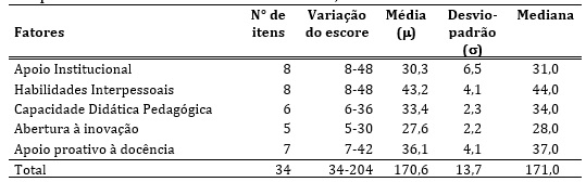 O fator Apoio Institucional é descrito como a percepção dos docentes em relação ao suporte recebido pela instituição desde a sua qualificação profissional até o plano de carreira. O fator Habilidades interpessoais identifica a percepção do docente da habilidade interpessoal com o aluno em relação à troca efetiva do conhecimento favorecendo o relacionamento de confiança profissional entre docente e aluno. O fator Capacidade Didática Pedagógica relaciona-se com o processo ensino aprendizagem e capacidade de liderança didática do professor. O fator Abertura à Inovação está relacionado com a percepção do docente na busca de inovações, resoluções de problemas e entusiasmo no processo ensino aprendizagem para com o aluno. O fator Apoio Proativo à Docência revela a dimensão do pensamento do docente quanto à busca de diferentes formas de avaliação para acompanhar a aprendizagem do aluno e dificuldades e limitações do mesmo13.