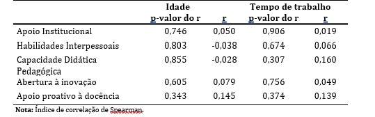 Na correlação das variáveis numéricas idade e tempo de trabalho na instituição em relação às dimensões da “Escala de fatores que influenciam na percepção das competências para o exercício da docência” não se observou correlações significativas (Tabela 3).
