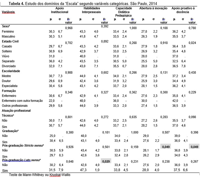 Considerando o fator Apoio Proativo à Docência, houve diferença estatisticamente significante na variável atuação na pós-graduação Stricto Sensu (p-valor=0,049), este dado revela menor percepção do docente quanto à busca de diferentes formas de avaliação para acompanhar a aprendizagem do aluno, dificuldades e limitações (Tabela 4).