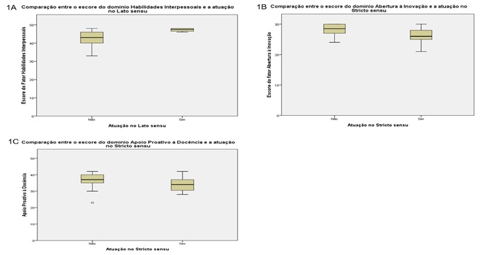 As comparações entre os escores dos fatores Abertura à Inovação e Apoio Proativo à Docência com a atuação no Stricto Sensu mostram características semelhantes, o grupo de professores que atuam no Stricto apresentaram menores valores de mediana e quartis 1 e 3 em ambas as comparações (Figura 1B e 1C).