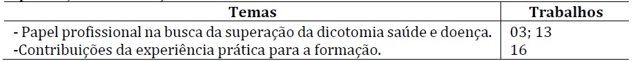 Ao abandonar a contraposição linear saúde-doença privilegiam-se os processos sócio-históricos, culturais e psicossomáticos e a concepção do papel de cada profissional na atenção à saúde, que ganha assim, novo colorido, surgindo, desde o início da formação a percepção da necessidade de articulação dos saberes13. A Tabela 3 apresenta os temas que compuseram esta categoria e os trabalhos que contribuíram para a construção dos núcleos de sentido.