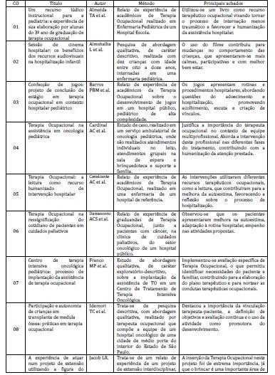 Para a seleção dos trabalhos adotou-se como critérios de inclusão estar relacionada à população-alvo criança(s), relatarem a intervenção terapêutico-ocupacional no contexto hospitalar e serem publicados na modalidade comunicação oral. Como critérios de exclusão adotou-se trabalhos que não se referiam à atuação clínica junto à pessoa com câncer, adultas ou idosas.