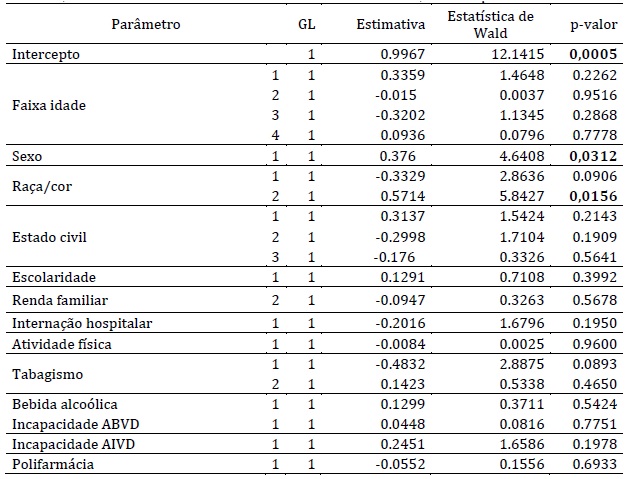 A prevalência de HAS em idosos foi de 74,7%, as variáveis sexo e raça apresentaram significância estatística, indicando que Idosos do sexo masculino apresentaram duas vezes mais chances de hipertensão do que o sexo feminino, assim como os idosos de raça negra apresentaram duas vezes mais chances de hipertensão do que os de raça parda (Tabela 2).