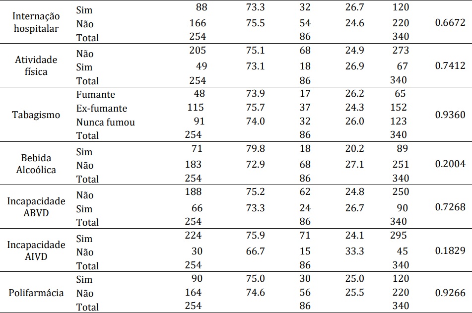 As categorias para o tabagismo foram: fumantes, não fumantes e ex-fumantes. O consumo de bebidas alcoólicas foi categorizado em “sim” e “não”, questionados em relação aos 30 dias anteriores à entrevista. A atividade física no lazer foi categorizada em “sim” e “não”. A variável polifarmácia foi considerada quando o idoso utilizava 5 ou mais medicamentos de diferentes classes farmacológicas9.