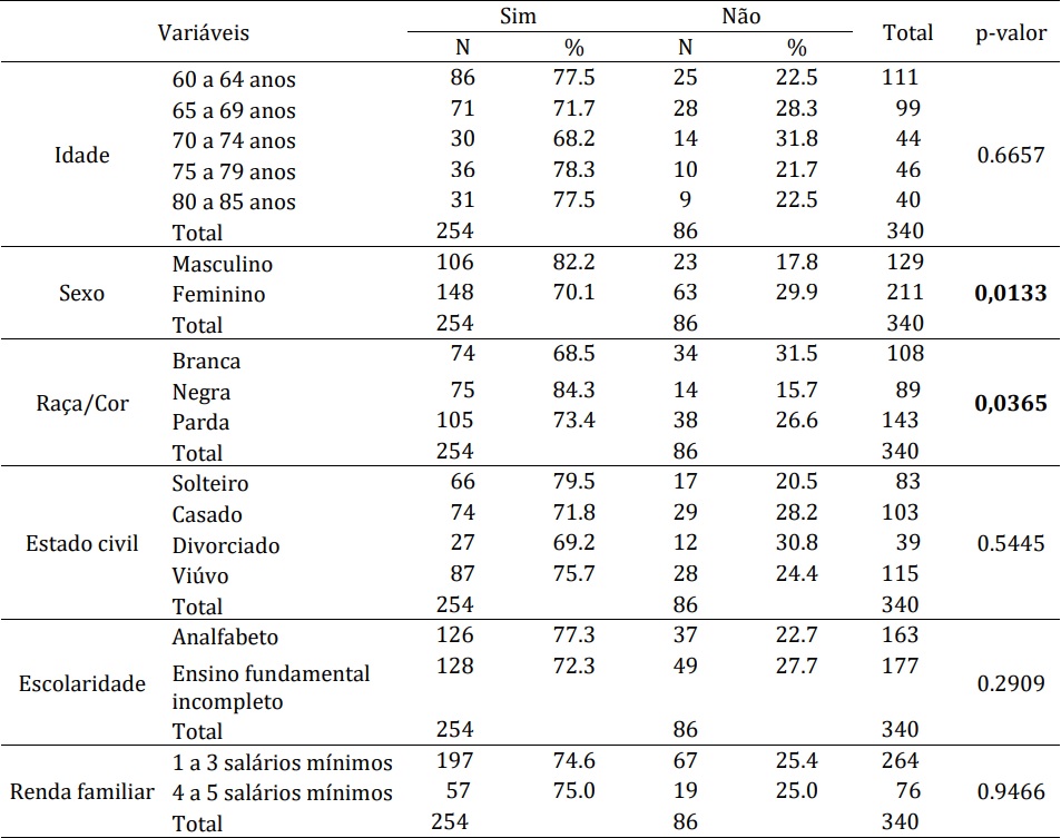 Resumen: La hipertensión arterial sistémica es una enfermedad altamente prevalente en individuos ancianos, volviéndose un factor determinante en la morbilidad y mortalidad elevadas de esa población. El objetivo de este estudio es analizar las características epidemiológicas de la hipertensión arterial sistémica (HAS) y los factores asociados en la población anciana acompañada por una Unidad Básica de Salud de la zona sur de la ciudad de São Paulo. Se trata de un estudio transversal realizado por medio de una encuesta domiciliaria con 340 ancianos. Los participantes eran en su mayoría mujeres (62%), en el grupo de edad de 60 a 69 años. La prevalencia de la hipertensión fue de 74,7%. Los factores asociados a la hipertensión fueron: sexo masculino (p-valor 0,0133) y raza negra (p-valor 0,0365). La HAS presentó alta prevalencia en los ancianos investigados, siendo mayor en determinados subgrupos: hombres, baja escolaridad y raza negra. El aumento de la población anciana, evidencia mayor número de problemas crónicos, entre ellos la hipertensión arterial.
