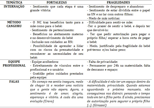 As mães revelaram sentimentos mistos de medo, angústia, culpa, incapacidade, tristeza, insegurança, desespero, dúvidas, luta, amor, alegria, carinho, vitória, entre outros inúmeros que perpassam esse período de adaptação. No quadro a seguir destacam-se as principais fortalezas e fragilidades que permeiam o processo de internação do RN.