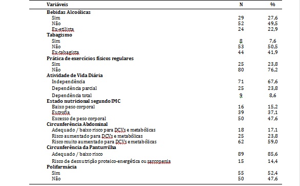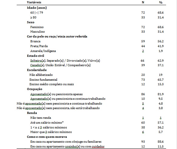 As perdas referiram-se a pacientes que não compareceram às consultas médicas, e àqueles que não aceitaram participar da presente pesquisa. Não houve participante com déficit cognitivo ou síndrome demencial na ausência de seus acompanhantes, nem questionários excluídos na tabulação dos dados. Ao final, obteve-se a amostra composta por 105 idosos, 100% da amostra mínima inicialmente definida.