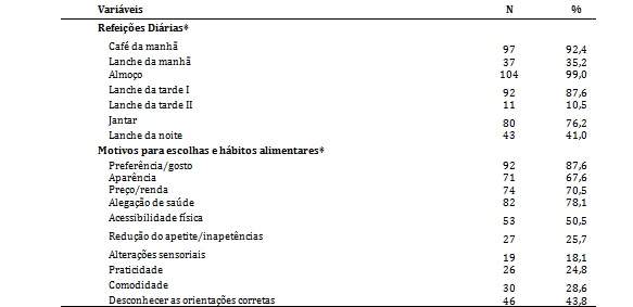 No tocante ao comportamento alimentar (Tabela 3), pode-se observar que a maioria dos idosos realizava diariamente as refeições: café da manhã (92,4%), almoço (99%), lanche da tarde I (87,6%) e jantar (76,2%). E, sobre os motivos para as escolhas alimentares e padrão dos hábitos alimentares, destacaram-se: preferência/gosto (87,6%), alegação de saúde (78,1%), preço/renda (70,5%), aparência (67,6%) e acessibilidade física (50,5%).