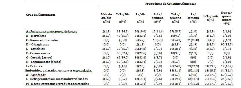 Pôde-se observar sobre a frequência de consumo alimentar, um consumo diário dos alimentos dos grupos: frutas ou suco natural de frutas (57,1%); hortaliças (79,1%); laticínios (62,9%); carnes e ovos (80%); cereais a exemplo o arroz (92,4%); e leguminosas como os feijões (85,8%). Um consumo semanal ou com menor frequência para os grupos alimentares: raízes e tubérculos; oleaginosas; frituras; embutidos, enlatados, conservas e congelados; Fast-foods; refrigerantes ou sucos industrializados; e doces, compotas e produtos açucarados (Tabela 4).
