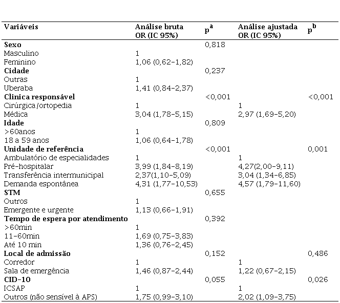 Na análise bruta, sujeitos atendidos pela clínica médica (OR=3,04; IC95%= 1,78-5,15), referenciados pelo pré-hospitalar (OR=3,99; IC95%= 1,84-8,19), por demanda espontânea (OR=4,31; IC95%: 1,77-10,53) e por transferência intermunicipal (OR=2,37; IC95%: 1,10-5,09), admitidos na sala de emergência (OR=1,46; IC95%: 0,87-2,44) e classificados quanto ao CID por condições não sensíveis à atenção primária (OR=1,75; IC95%: 0,99-3,10) apresentaram associação significativa com o tempo de permanência no pronto-socorro adulto acima de 24 horas (Tabela 2).