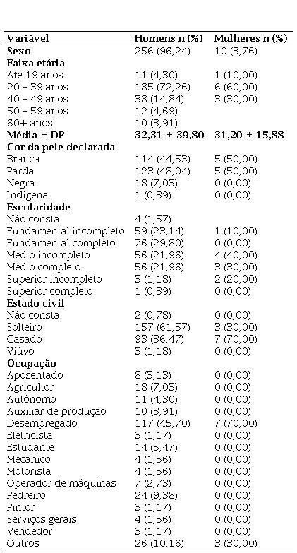 O perfil dos homens mostrou que a maioria tinha idade entre 20 a 39 anos, de cor branca ou parda, solteiros, com ensino fundamental completo e desempregados. O perfil das mulheres evidenciou que a maioria tinha idade entre 20 a 39 anos, cor branca ou parda, casadas, com ensino médio incompleto e desempregadas (Tabela 1).