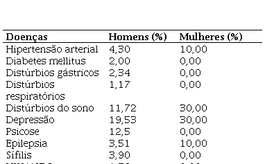 As doenças mentais foram as que aparecem com maior frequência, destacando-se a depressão em 19,53% nos homens e em 30% das mulheres, seguida das psicoses em homens e dos distúrbios do sono tanto em homens quanto em mulheres. Uma parcela da população masculina apresentava a sífilis (Tabela 2).