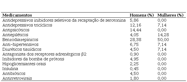 Quanto ao consumo medicamentoso, a classe mais usada foi a dos benzodiazepínicos em 50% das mulheres e 28,38% dos homens, seguida dos antidepressivos (Tabela 3).