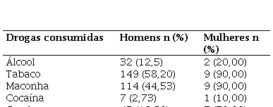 No consumo de drogas, destacou-se o tabaco tanto por homens (58,20%) quanto por mulheres (90%); seguida de maconha (Tabela 4).