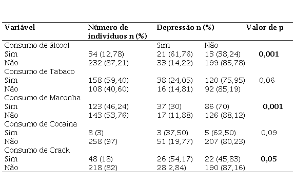 Os dados apresentados na tabela 5 mostram que o consumo de drogas como álcool, maconha e crack predispunham o desenvolvimento de depressão, evidenciado pelo valor de p ≤ 0,05. O desenvolvimento de hipertensão e diabetes não mostrou correlação com o consumo de drogas sejam lícitas ou ilícitas (dados não apresentados).