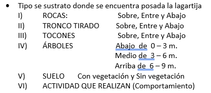 Los muestreos mensuales con duración de 5 días, se realizaron a lo largo de un ciclo anual de abril de 2015 a mayo de 2016. Los ejemplares se capturaron con la mano (Gaviño, 1977 y Knudsen, 1966). Todos los organismos se enumeraron, con una etiqueta, y se tomaron los siguientes datos: hora de colecta a la que se observó la lagartija, temperatura corporal, temperatura ambiental, temperatura del microhábitat donde se encontró, humedad ambiental, sexo y edad. Cada organismo se designó de la siguiente manera; macho adulto (M.A.); macho juvenil (M.J.); cría de macho (M.C.); hembra adulta (H.A.); hembra juvenil (H.J.); cría de hembra (H.C.).
