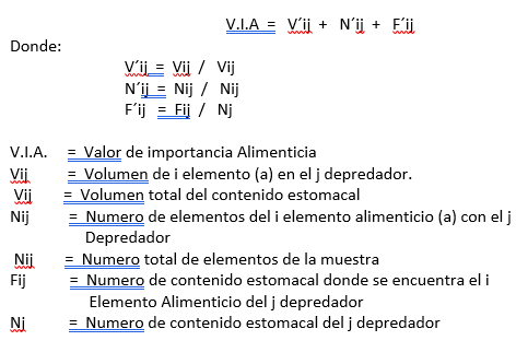 Con la información registrada se obtuvieron tres parámetros básicos para el estudio alimentario, para cuantificar la importancia de cada familia–presa en la dieta del organismo, para ello se utilizó el índice de Valor de Importancia, el cual suma tres valores (volumen, peso y frecuencia) para cada presa y define la importancia de un elemento alimenticio en la dieta de un organismo (Acosta, 1982) y se obtiene con la siguiente formula: