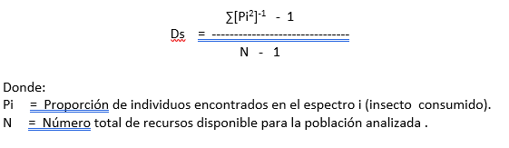Para la comparación de las fluctuaciones de la diversidad específica en la relación con las temperaturas y humedad, se utilizó el índice de Diversidad de Shannon y Weaver (Brower y Zar, 1981), para evaluar la diversidad de las especies que constituyen la dieta.
