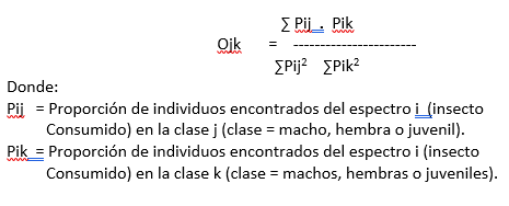 Para el solapamiento de nichos entre sexos y clase de edad se utilizó el índice propuesto por Pianka (1973), teniendo a 0 para las poblaciones que no se solapan y a 1 para las poblaciones con un 100% de solapamiento.