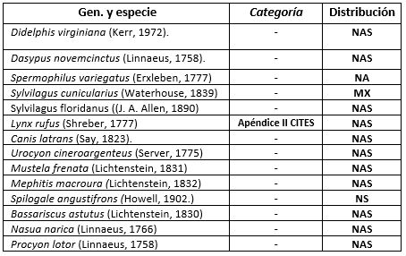 En el presente estudio se registraron 14 especies de mamíferos, de las cuales 4 son nuevos registros para las personas de la comunidad (D. novemcinctus, L. rufus , M. frenata y N. narica), de acuerdo al diagnóstico ambiental realizado por Sánchez-Hernández (2001), además de la actualización de la especie S. angustifrons reportada como S. putorius angustifrons, basando su determinación en el manual de rastreo de mamíferos silvestres de México de Aranda (2012) y la taxonomía marcada por Wozencraft (2005). Esta riqueza es considerable tomando en cuenta que San José Deguedó es un área sumamente perturbada, que presenta un alto impacto de actividades antropogénicas, en donde la vegetación natural está restringida a manchones pequeños dispersos en una matriz de cultivos y zonas para el pastoreo extensivo, población dispersa y obras de infraestructura (Sánchez-Hernández, 2001). El orden Carnívora fue el más representativo ya que es el tercer orden más representativo en México y además es uno con el mayor número de géneros monotípicos, reflejándose en la riqueza de especies por familia del mismo (Ceballos y Oliva, 2005).