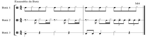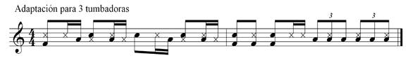 El ritmo a continuación es conocido como “Chachá - Rocafú” y es utilizado como puente o transición entre uno y otro ritmo previamente asignado a diferentes deidades. ( ver figura #2 y #3 en reducción)