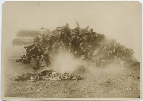 Este conjunto de imágenes conforma una estampa del conflicto armado propicia para la unidad nacional y el propósito de suturar las heridas, puesto que destaca los momentos altamente simbólicos -y por lo tanto memorables- del proceso revolucionario y relega aquellas imágenes que, por una parte, podrían reavivar la pesadumbre de quienes experimentaron directamente la furia de la Revolución y que, por otra, testimonian desorden, destrucción y muerte. En este imaginario canónico no tienen cabida, por ejemplo, las oscuras montañas de cadáveres (Figura 3) ni los suelos tapizados de gente recién fusilada (Figura 4): ambas estampas ponen en entredicho la naturaleza impetuosa pero redentora de la Revolución que habían confeccionado las élites políticas y culturales.