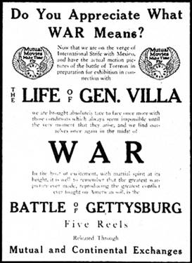 Ya sea por un propósito meramente noticioso o ya por un afán propagandístico, el cine documental produjo horas y horas de metraje que consiguen capturar muchas de las diversas y muy contradictorias caras de la Revolución. Ahora bien, a diferencia de eventos de corte oficial, como la conmemoración de fechas históricas mediante desfiles o la firma de acuerdos o alianzas, que por naturaleza suponen una puesta en escena que transmite sin dificultad alguna un mensaje claro, las imágenes destinadas a nutrir las películas de contenido bélico debían pasar por ejercicios de montaje que condicionaran la recepción de las imágenes. Este condicionamiento era reforzado por paratextos, entre ellos los anuncios periodísticos que avisaban acerca de la proyección de cierto documental. Tales anuncios no solo contenían los datos sobre la fecha y el lugar de la exhibición, sino que además ofrecían una breve sinopsis que de alguna manera encauzaban la lectura de las imágenes del documental, con frecuencia echando mano de la antigua y muy conocida estrategia de distribuir la violencia de acuerdo con los intereses que defendía el emisor del anuncio. Como ejemplo tenemos el “diálogo” que mantuvieron los documentales Sangre hermana (1914), de filiación huertista, y La Revolución zapatista (1914), cinta de propaganda zapatista. El primer filme, estrenado en el teatro Lírico, era publicitado en los siguientes términos: “El público podrá ver con claridad meridiana los horrores del zapatismo. Verá desfilar a nuestro valiente ejército trabando combate con los zapatistas; se verán los pueblos incendiados y el terrible castigo que reciben los culpables” (citado en Jablonska, 1997, p. 63). La segunda película fue proyectada en el teatro-circo Welton, y se promocionada así: