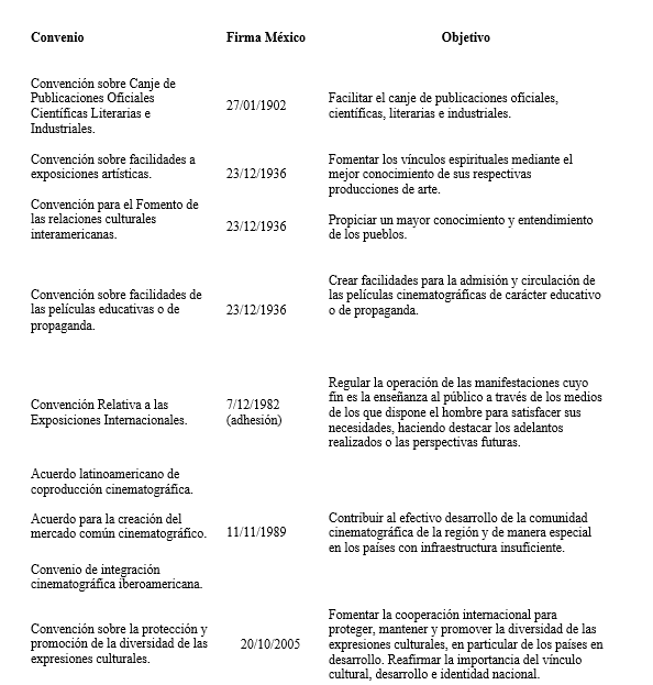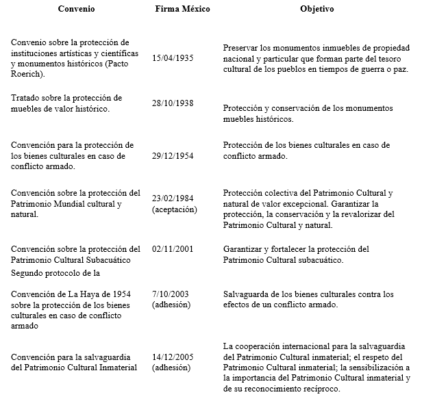 Durante el siglo XX las políticas culturales comenzaron a adquirir mayor valor, particularmente en el periodo entre Guerras Mundiales y después de la Segunda Guerra Mundial en el marco de Guerra Fría. Las políticas culturales se inscriben en procesos amplios y vinculadas a “esquemas [de] gobernabilidad interna, diplomacia y seguridad de las naciones [además] refleja el equilibrio geopolítico del momento” (González, 2010, p. 14). Cada país utiliza las políticas culturales con fines claros y específicos. No es de extrañar que en los años treinta se diera una proliferación en la firma de acuerdos internacionales relacionados con la protección y salvaguarda de las artes y el Patrimonio Cultural. Por lo que respecta a México, la primera vez que el país firmó un tratado de este tipo fue en 1902 con la firma de la Convención sobre Canje de Publicaciones Oficiales Científicas Literarias e Industriales, pero no fue sino hasta 1935 que suscribe otro convenio en la materia, el Pacto Roerich, además de suscribir otros tres convenios en vinculados con la cooperación cultural en 1936 y uno más referente Patrimonio Cultural en 1938 (ver tablas unoy dos).
