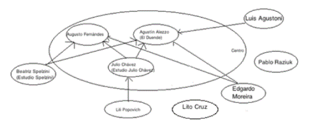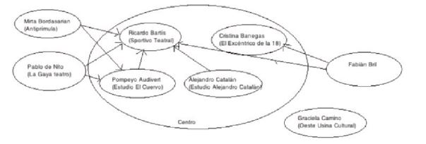 Entre los estudiantes de teatro, esta situación es similar con elagregado de que, cuando se trata de un maestro periférico de un circuito -como lo es Lili Popovich del circuito realista (ver esquema 1)-, se suele mencionar al maestro de ese maestro, que en general es alguien conocido. Así, los linajes funcionan, también, como una forma de dar sentido y organizar a algunos de los nombres que circulan en el teatro alternativo.