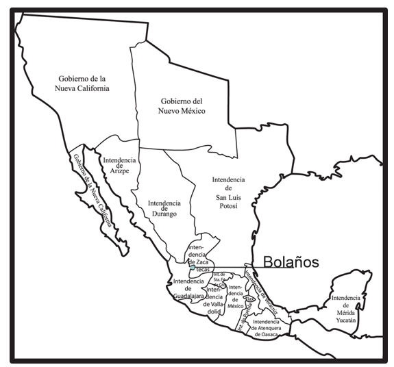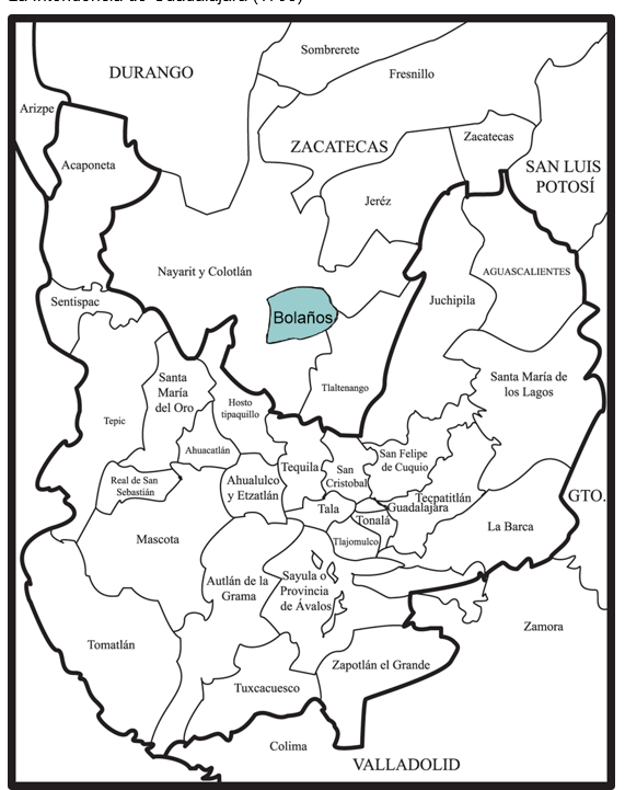 Cabe destacar que el Real de Minas de Bolaños se localizaba en el norte de la Nueva Galicia, y estaban bajo su jurisdicción una serie de pueblos indios, ranchos y haciendas. Al respecto, Gerhard (1996) destaca que este Real de Minas constituía una circunspección rodeada casi en su totalidad por diversas comunidades indígenas, adscritas al territorio militar de las Fronteras de San Luis Colotlán, fue establecido en las cercanías de las antiguas minas de San Martín Tepeque y en el borde del Real de Santa Rosa, entre 1730 y 1735 (p. 95). (Véase Imagen 1).