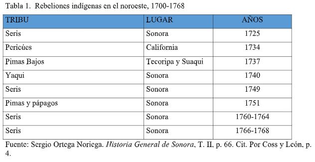Coss y León (2000) refiere que en Sonora, en el siglo XVIII, la población indígena y los españoles (tanto militares, misioneros religiosos y civiles) se encontraban en constantes conflictos. Pueblos indios como los seris, pimas, yaquis y apaches se oponían a la presencia española en la región norte, y ya desde el siglo XVI, con las primeras incursiones europeas, se habían mostrado reacios a la acción colonizadora que intentaban las avanzadas misioneras a cargo de los jesuitas, quienes practicaban la labor misionera a partir de congregaciones en las que se alentaba la sedentarización de los indígenas y su gradual cristianización, así como también la enseñanza de oficios y la agricultura. No obstante, por un lado, la belicosidad de los indígenas; y por otro, los constantes conflictos entre las autoridades militares de la provincia y los misioneros en cuanto a la estrategia a seguir para la pacificación y sometimiento de los naturales a la autoridad colonial, generaron como resultado que Sonora fuera una región de constante inestabilidad.