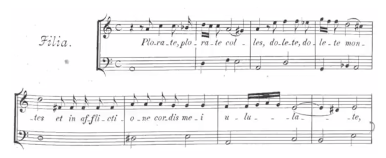 Podemos apreciar su intensidad afectiva en uno de los primeros ejemplos conocidos, la ópera Jephté (1648) de Carissimi –Figura 10– donde se encadenan dos napolitanas seguidas en un pasaje secuenciado, si bemol en tonalidad de la menor y, a continuación, mi bemol en tonalidad de re menor, vecina de aquella: