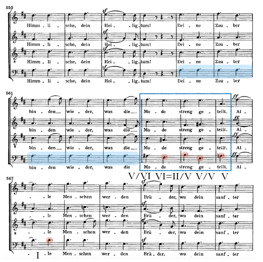 Entre los innumerables ejemplos de dominante secundaria que podemos observar en la música académica elegimos, tal vez, el más famoso, procedente de la Novena Sinfonía Op. 125 de Beethoven (Figura 12), cuyo último movimiento contiene un fragmento coral sobre la Oda a la Alegría de Schiller13, de larga transcendencia para la música culta posterior y, también, para la música popular del siglo XX. Se trata de un tema arquitectónicamente sencillo con forma ABA', en donde el fragmento previo a la recapitulación del tema inicial –precedido por un pedal de dominante, en azul, al que sigue una serie de quintas, en rojo– contiene un patrón funcional arquetípico (II-V-I), iniciado por la sensible (la sostenido) del sexto grado (si menor), punto hacia el que gira el discurso puntualmente –este si menor representa un acorde puente como segundo grado de la dominante y sexto de la tónica, de ahí la equivalencia VI=II, tiene función en ambas tonalidades, re mayor y la mayor–, resolviéndose sobre la dominante secundaria (V/V) con una síncopa de gran efecto sobre la dominante (V) hacia la recapitulación del tema.