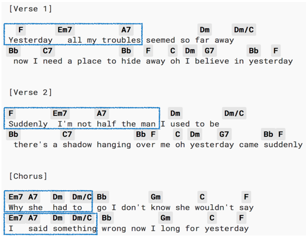 Estructuralmente, este fragmento pertenece al estribillo donde más que la mera repetición de la frase señalada anteriormente –como en temas menos elaborados, por ejemplo, Yellow Submarine–, podemos apreciar la calculada gestión, tanto a nivel musical como textual de un material reducido y sencillo que, sin embargo, frente al peligro de la monotonía, siempre aparece variado, como se aprecia en la Figura 15: