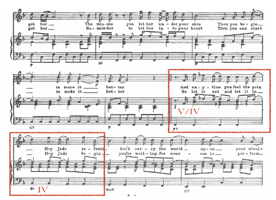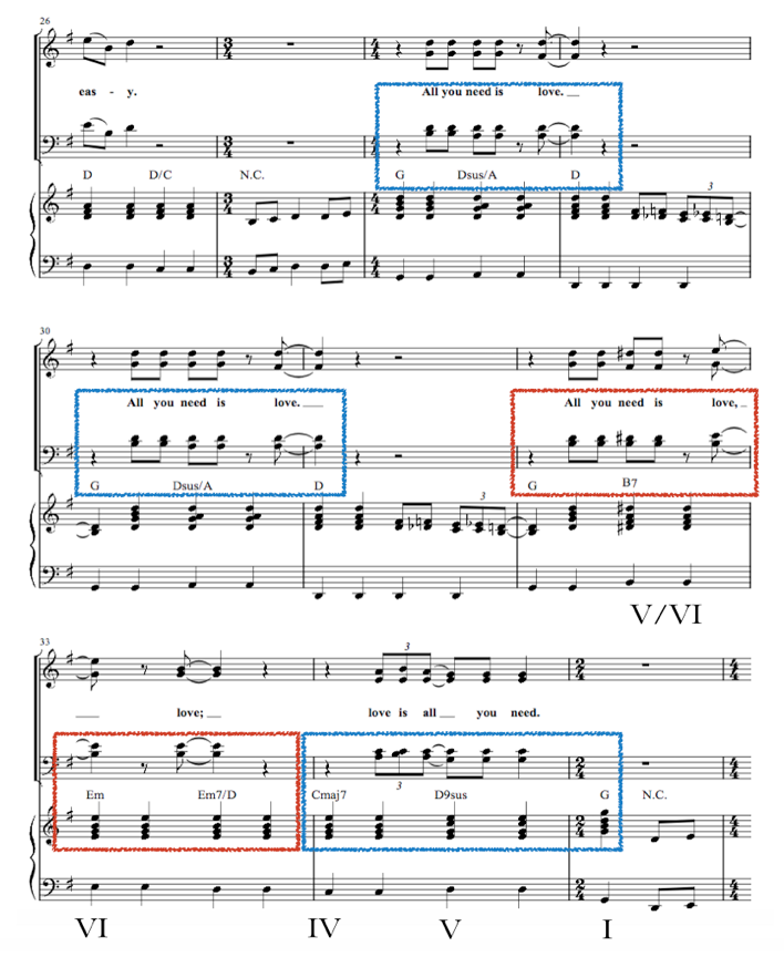 En esta canción, la dominante secundaria también ejerce de elemento reiterativo, pero de una manera distinta que en el tema anterior, dado que el acorde alterado y su carga afectiva se utilizan para remarcar, por tercera vez, un mensaje repetido –all you need is love– que desemboca en una nueva sorpresa tras la dominante secundaria (de nuevo, quinto del sexto): la inversión de la estructura de la frase junto con su resolución sobre la tonalidad principal, love is all you need.