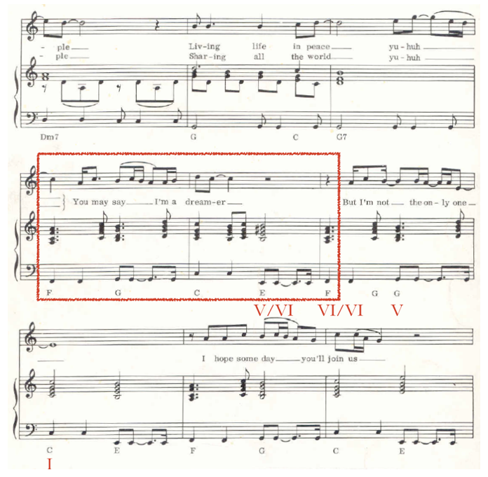 De igual manera, tras una estrofa, la primera simple y diatónica –el motivo cromático que abre el tema, incluso, parece una inversión de lo observado en el estribillo de All you need is love–, el estribillo de Imagine que presenta el mensaje más poderoso de la canción (You may say, I'm dreamer..., but I'm not the only one), viene realzado, de nuevo, por la aparición de la dominante secundaria, en este caso, quinto del sexto, que, sin embargo, no resuelve sobre sobre la tónica esperada, la menor, sino sobre el sexto grado de esta, fa mayor, es decir, en una cadencia rota o evitada de gran efecto expresivo (Figura 17):