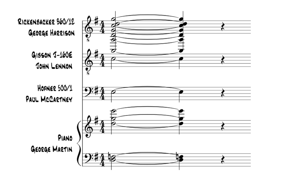 Los éxitos se fueron sucediendo. She loves you (1963) con autoría de “Lennon (.5) y McCartney (.5)” (Dowlding, 1995, p. 39) lanzaba un mensaje directo y, por tanto, diferente al resto de las letras adolescentes sobre el amor que se habían escrito hasta entonces, estaba en tercera persona y decía directamente: “ella te quiere”. La decisión de emplear en la armonía una sexta añadida al final del tema (Everett, 2013) fue algo inusual para la música popular de entonces; algo similar ocurrió con la canción que dio título al álbum AHard Day’s night “Lennon (1.00)” (Dowlding, 1995, p. 64), editado en 1964 con el tañido de un acorde –que se observa en la Figura 1– que podría interpretarse como Fadd9 (con la novena mayor, la séptima mayor y la sexta añadida), donde Harrison hizo uso de una guitarra Rickenbacker 360/12 de doce cuerdas.