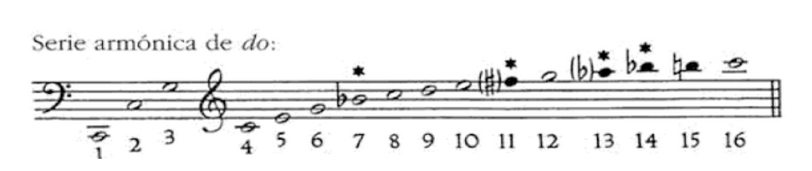 Las notas cromáticas existen desde los orígenes de la música, desde los tiempos de la antigüedad grecolatina, de hecho, la etimología de la palabra, chroma, procede de la lengua griega4. A partir del descubrimiento del monocordio por parte del círculo pitagórico, en torno al año 500 a.C., fue posible desentrañar la serie acústica que posibilitó, posteriormente –obsérvese la Figura 7–, la formación de escalas (diatónicas) y la aparición, a causa de estas leyes acústicas, de ciertas notas alteradas –armónicos siete y once– que hacen entrever el sistema tonal como posteriormente se constituyó, dado que estos sonidos se cuentan como alteraciones necesarias en las tonalidades vecinas (fa mayor y sol mayor, respectivamente) a do mayor, la escala diatónica por excelencia5.