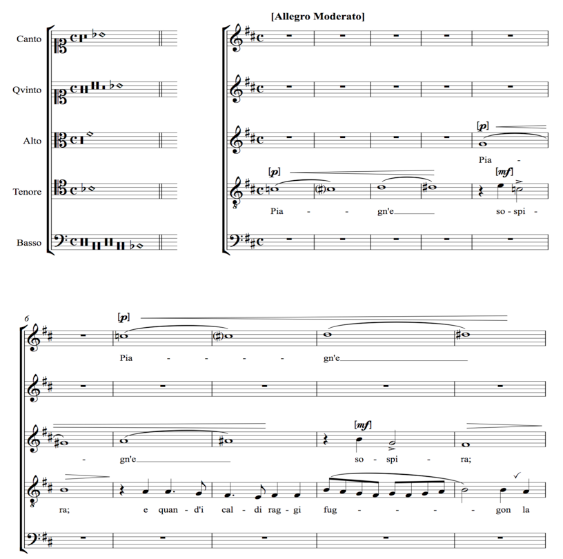 A continuación, podemos observar un ejemplo en Kühn (2007), en la Figura 8, sobre la obra de Monteverdi, Piagne e sospira, procedente de Il Quarto libro de madrigali a cinquevoci, publicado por primera, vez en Venecia (1603):