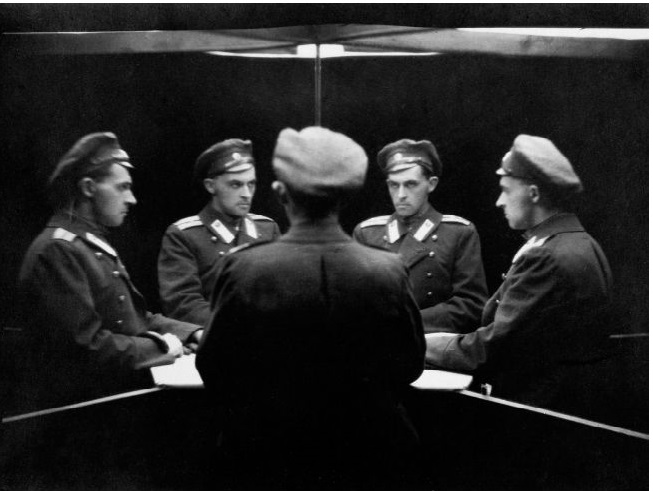 Por otra parte, si acudimos nuevamente al texto de Reichstein, la autora nos advierte que retratos de este tipo no pasaron desapercibidos para otros artistas. Picabia y Henri Pierre Roché también cuentan con una multifotografía en 1917, pero en años previos el arquitecto, músico y fotógrafo polaco Waclaw Szpakowski en 1912 y el pintor, escritor y filósofo Stanislaw Ignacy Witkiewicz -polaco también- en 1916 habían emprendido proyectos similares. A diferencia de Sam Auster, donde la mirada, digamos, está puesta en todas partes, Szpakowski tiene el hombro derecho metido ligeramente en dirección a la mesa, provocando que el resto del torso se incline hacia el lado contrario; este contraste, pequeño pero sustancial, genera que todos los reflejos estén atentos a sí mismos, incluso hasta con el espectador de la fotografía. En el retrato de Szpakowski (ver Figura 9) apreciamos de inmediato cómo el reflejo que está en frente a la derecha del modelo nos dirige la mirada y cómo el resto de los reflejos miran a este fijamente activando el juego especular. Por otra parte, Witkiewicz (ver Figura 10) se retrata vestido con el uniforme del ejército zarista. De gesto duro, suspicaz, como quien resiste un interrogatorio, el retrato fue tomado en San Petesburgo durante la Primera Guerra Mundial, años en que Witkiewicz formaba parte de la infantería rusa. Szpakowski murió en 1973, todo parece indicar que la fotografía referida no cuenta con mayores resonancias en el resto de su obra. Witkiewicz se suicidó en 1939, al menos en su obra pictórica la presencia del primer plano es evidente.