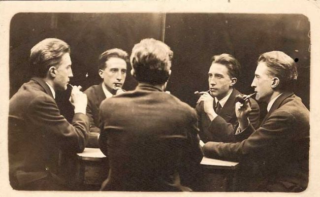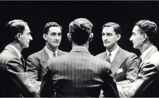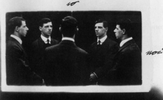 Se habrá notado que en una multifotografía la cámara debe posicionarse un par de metros detrás del fotografiado. Para obtener cinco perspectivas el ángulo de espejos debe ser de 72 grados, produciendo no sólo la multiplicación, también la desviación de miradas. El hecho de que la línea divisoria de los espejos contiguos no aparezca responde, seguramente, a fines estéticos; el fondo de la fotografía de Sam Auster es totalmente negro, pero en el resto de los ejemplos observamos que la presencia de los espejos es un elemento diegético fundamental. Como se quiera ver, justificaría aquello de la “penumbra que los rodea” y “la total inmovilidad de sus poses”, como si la ocasión de la reunión hubiera sido una “sesión de espiritismo”. No es azaroso tampoco el talante fantasmal que adjudica Auster a la fotografía: decíamos líneas arriba que el padre como cuenta pendiente regresa casi siempre a modo de espectro, de ahí que parezca que esté reunido con el solo propósito de autoinvocarse, “como si multiplicándose a sí mismo hubiera desparecido de forma accidental”. Es justo suponer que tal proceso de multiplicación e invocación es la exploración ensayística que emprende “Retrato de un hombre invisible”. Vemos que ninguno le regresa la mirada al otro. La mirada rebota entre los cinco. Se ha activado el juego especular. De laguna en laguna, la imagen unitaria del padre no es ya un asunto siquiera realizable; cada invocación lo fragmenta y lo multiplica. No por nada Auster declara que el proyecto le ocasiona una sensación de ahogamiento, y que el acto de escribir, en lugar de cicatrizar, abra la herida (Auster, 2012).